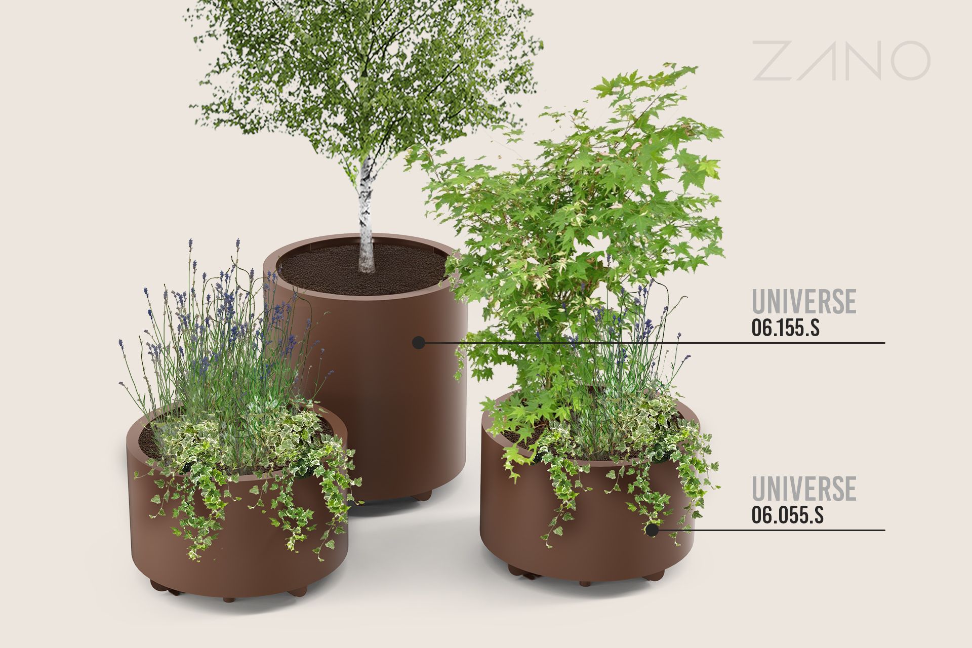 Donica Universe 06.155.S to wyższy wariant donicy w rozmiarze S, należący do serii mebli miejskich Universe, obejmującej donice i ławki. Model ten można zestawić z ławką Universe 02.455.3, tworząc spójną kompozycję przestrzenną. Konstrukcja donicy wykonana jest z blach stalowych o grubości 2 i 3 mm – ze stali węglowej S235JR, zabezpieczonej poprzez cynkowanie i malowanie proszkowe zgodnie z paletą RAL, lub opcjonalnie ze stali nierdzewnej 1.4301 w wersji szlifowanej. Dno donicy wyposażone zostało w cztery otwory drenażowe, co zapewnia prawidłowe odprowadzanie nadmiaru wody.
