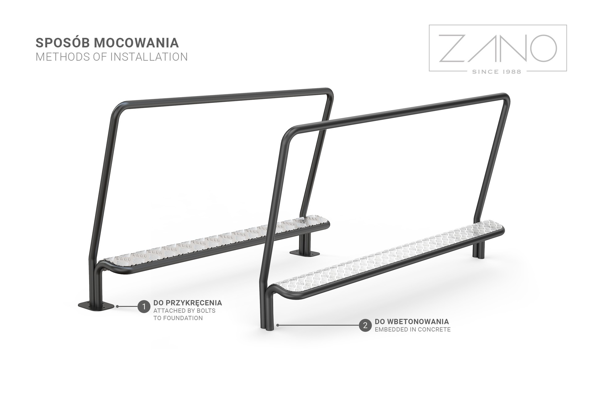 Podpora dla rowerzystów zbudowana jest z rurek i składa się z dwóch części. Na wyższej można się przytrzymać ręką, a na niższej - oprzeć nogę. Prosty design, pozwala na wkomponowanie jej w dowolną przestrzeń miejską. Podpora wykonana jest ze stali nierdzewnej lub ocynkowanej. Montaż przy pomocy fundamentu betonowego lub kołków rozporowych.